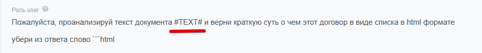 2. Здесь необходимо указать значение, которое будет вставлено в текст, отправляемый в модель. (Вспоминаем настройки промпта).