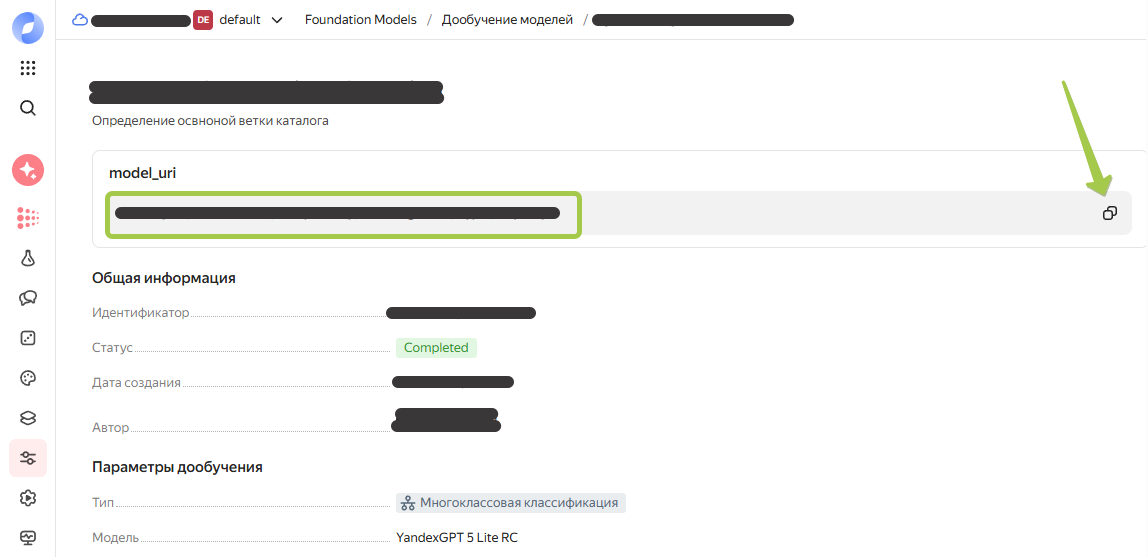 3. Uri дообученной модели. Ссылку URI можно получить в личном кабинете Yandex Cloud (см. скриншот ниже)