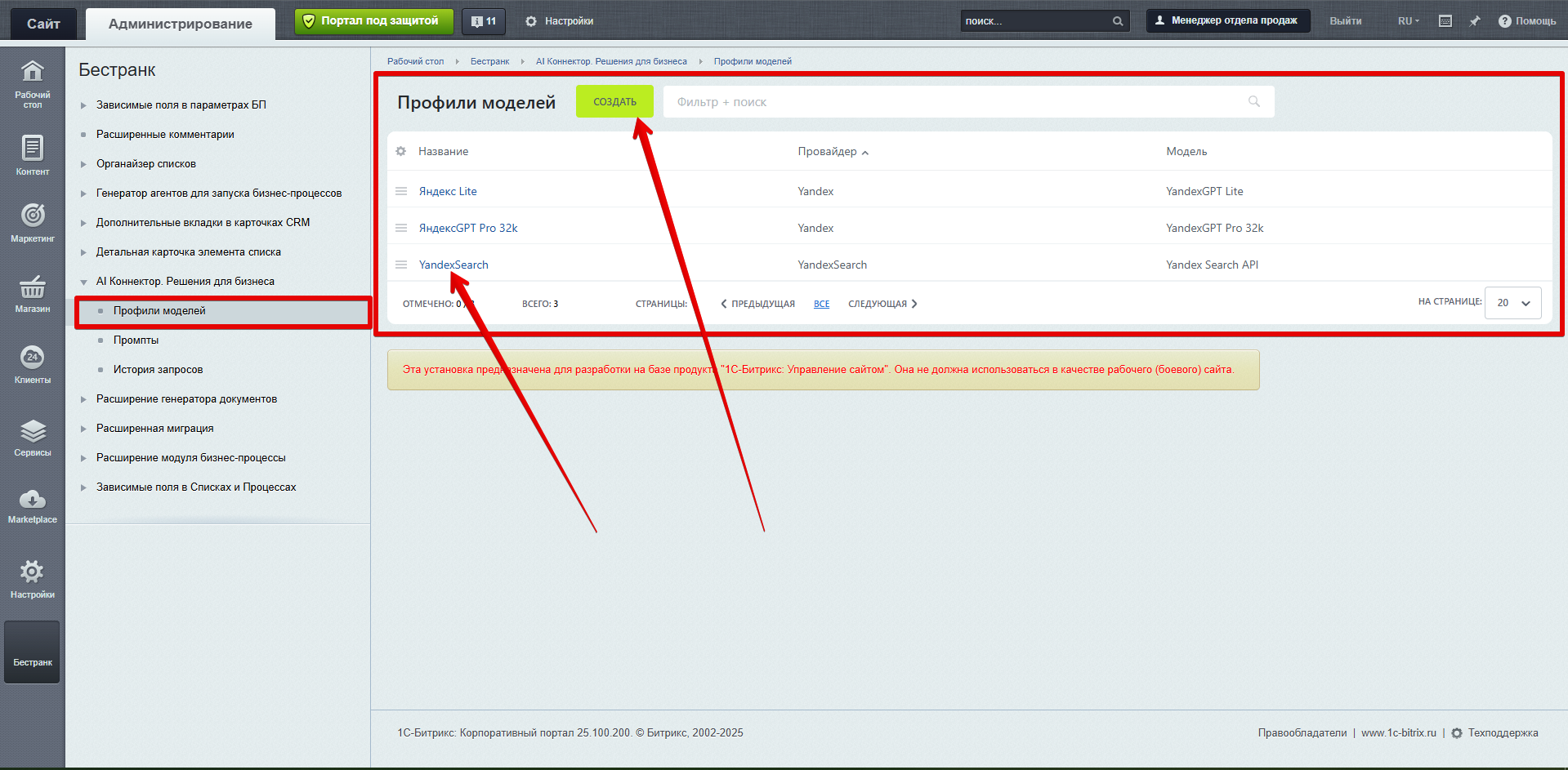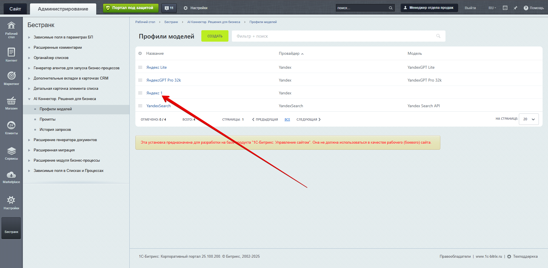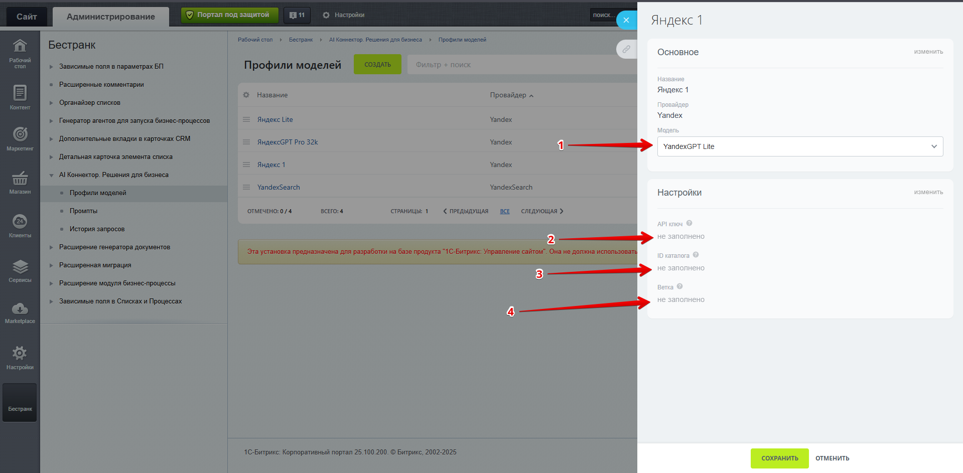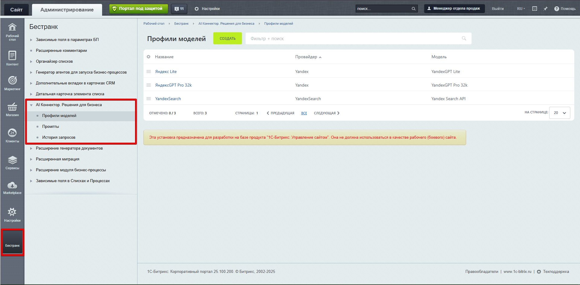 После загрузки и установки модуль появится во вкладке "Бестранк" -> "AI Коннектор. Решения для бизнеса".