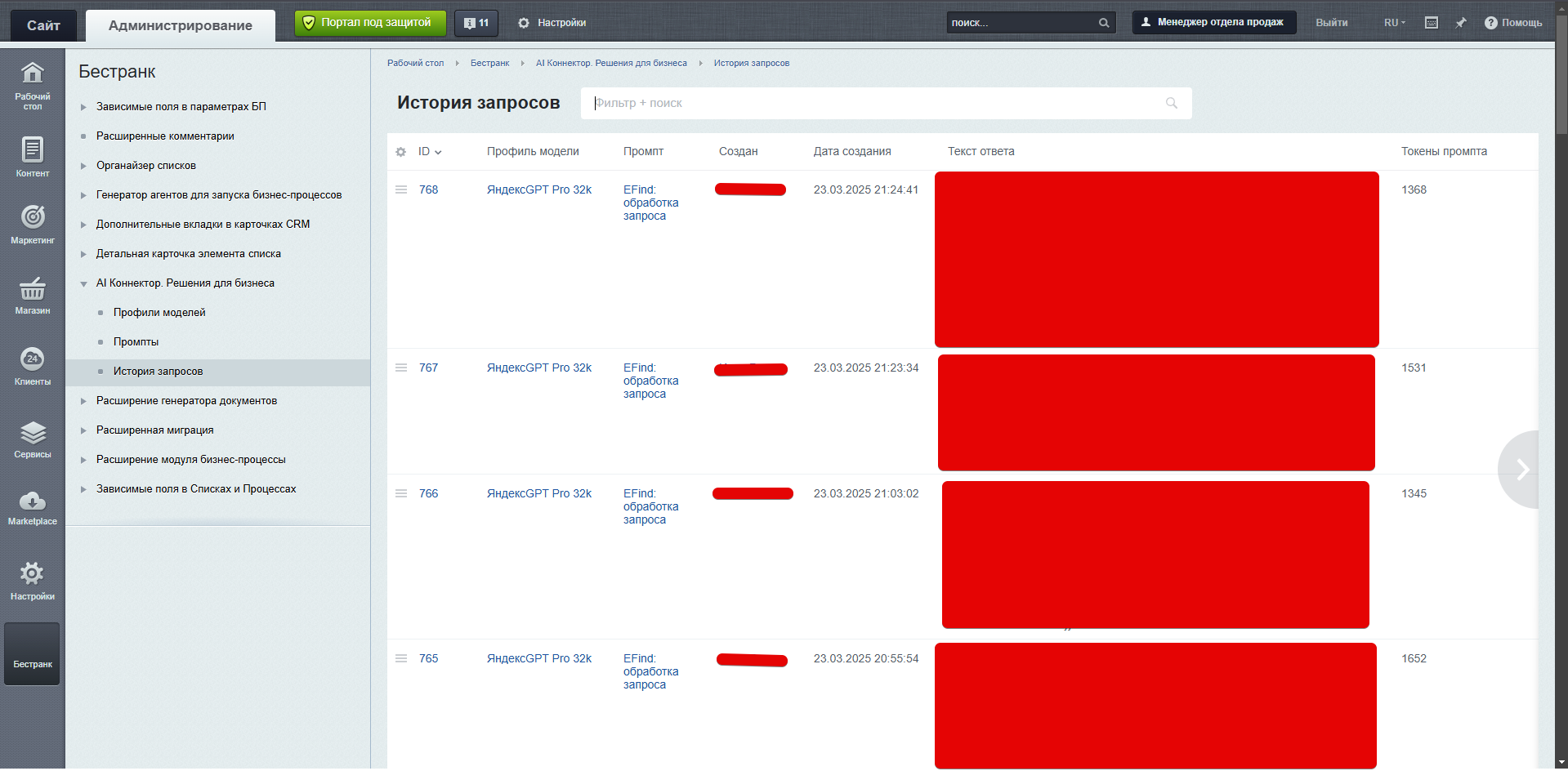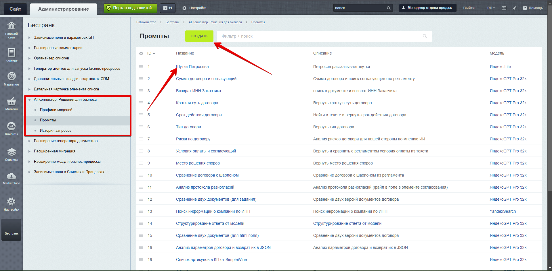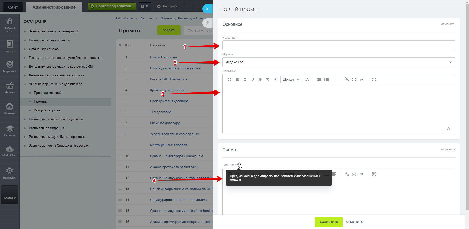 Все созданные промпты отображаются в административной панели на соответствующей странице в настройках модуля. Доступен выбор отображаемых полей, сортировка, перетаскивание столбцов, контекстное меню, постраничная навигация и другие штатные возможности работы со списками.