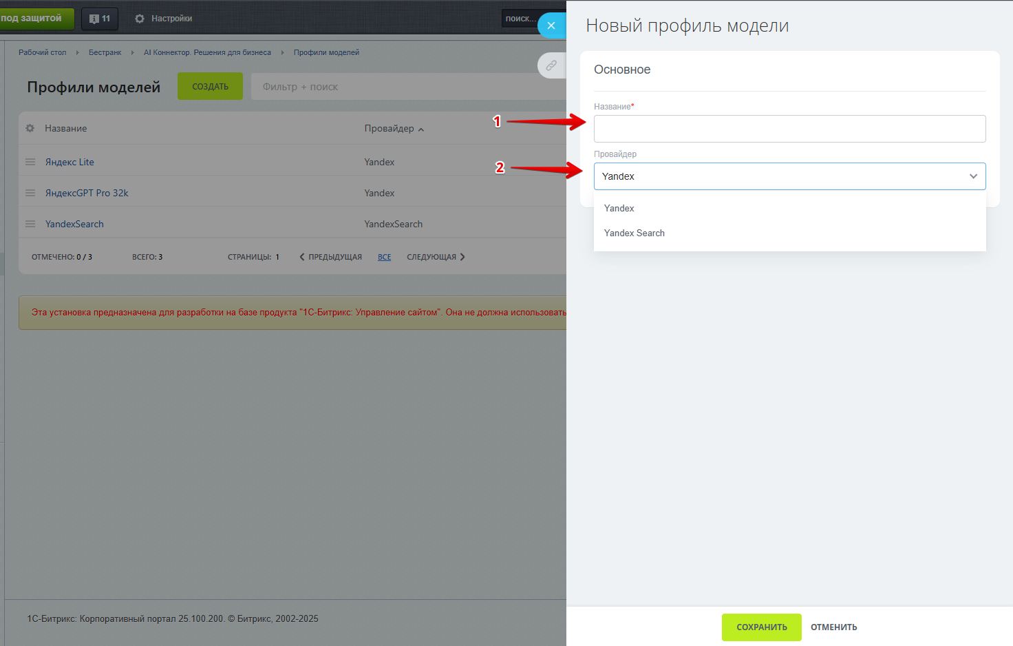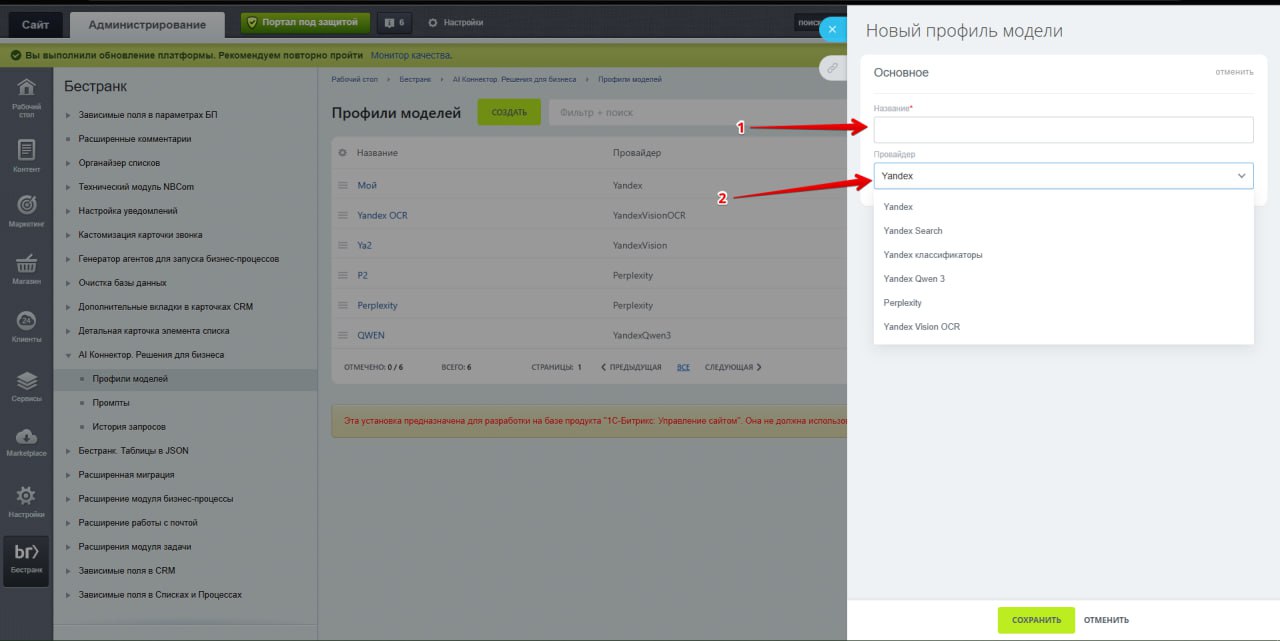 2. Провайдер (сейчас на выбор доступны Yandex, Yandex Search, Yandex классификаторы, Yandex QWEN 3, Yandex Vision OCR и Perplexity)