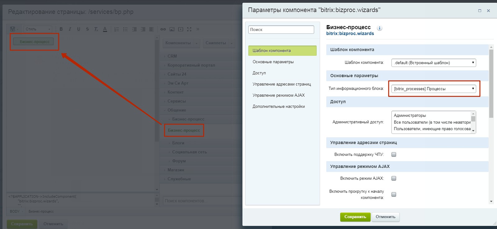 7. Обратите внимание, что БП рассчитан на запуск со страницы, на которой расположен компонент "Бизнес-процесс". Если у вас на портале нет страницы, отражающий бизнес-процессы, нужно её создать и вынести туда компонент «Бизнес-процесс» (bitrix:bizproc.wizards). В настройках компонента указать тип инфоблока [bitrix_processes] — Процессы.