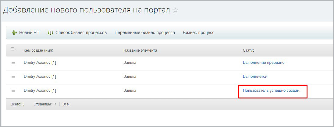 - Бизнес-процесс работает на основе бесплатного модуля «Создание пользователя (активити)».