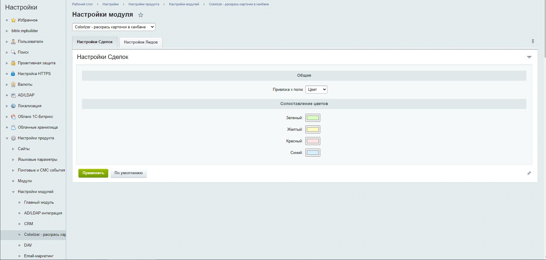 Настройка производится в стандартном меню настройки модулей: Настройки -> Настройки продукты -> Настройки модулей -> Colorizer