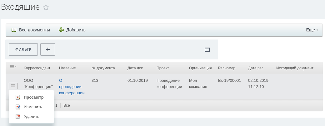 1. Учет входящей и исходящей корреспонденции