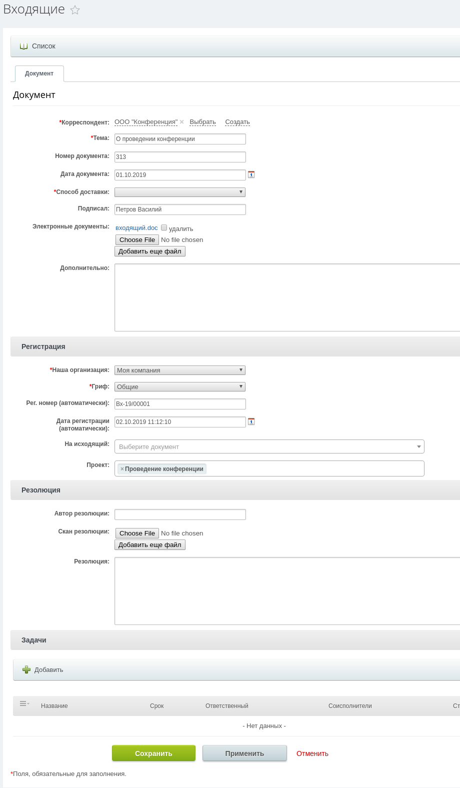- Регистрация входящих и исходящих документов
