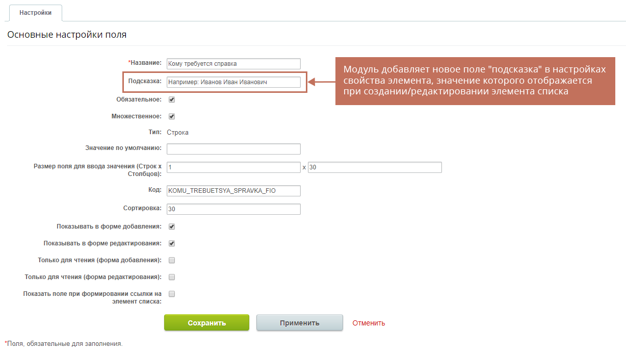 1. Чтобы отобразить подсказку к полю(свойству) элемента Списка или Бизнес-процесса(процессы в ленте) - перейдите в настройки этого поля(свойства) и укажите текст подсказки в поле Подсказка.