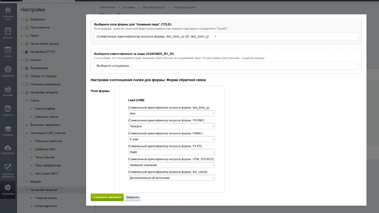 2. После установки модуля, перейдите в настройки модуля и настройте подключение к вебхуку, активность формы, соотношение полей и тд. По вопросам модуля и интеграций пишите на t.me/kuratov_bot