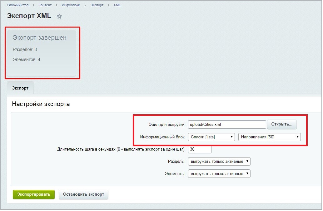 2) Перейдите в административную часть портала, раздел Контент —Инфоблоки — Экспорт — XML. Укажите название файла для экспорта с расширением xml и путь для его сохранения (например, /upload/document.xml). Выберите в поле «Информационный блок» — «Списки [lists]». В поле «Выберите инфоблок» задайте ваш инфоблок для миграции. Нажмите «Экспортировать». По указанному пути будет сохранен файл с данными списка, скачайте его.
