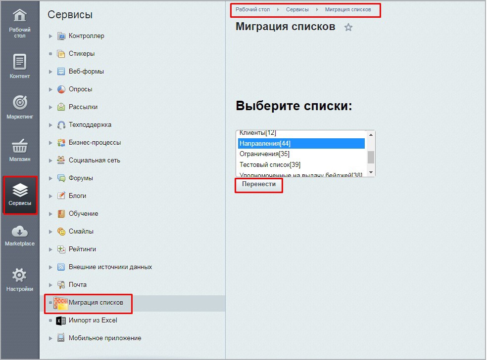 4. После установки модуль не требует никаких дополнительных настроек. В административной части на вкладке Сервисы появится новый пункт — Миграция списков.