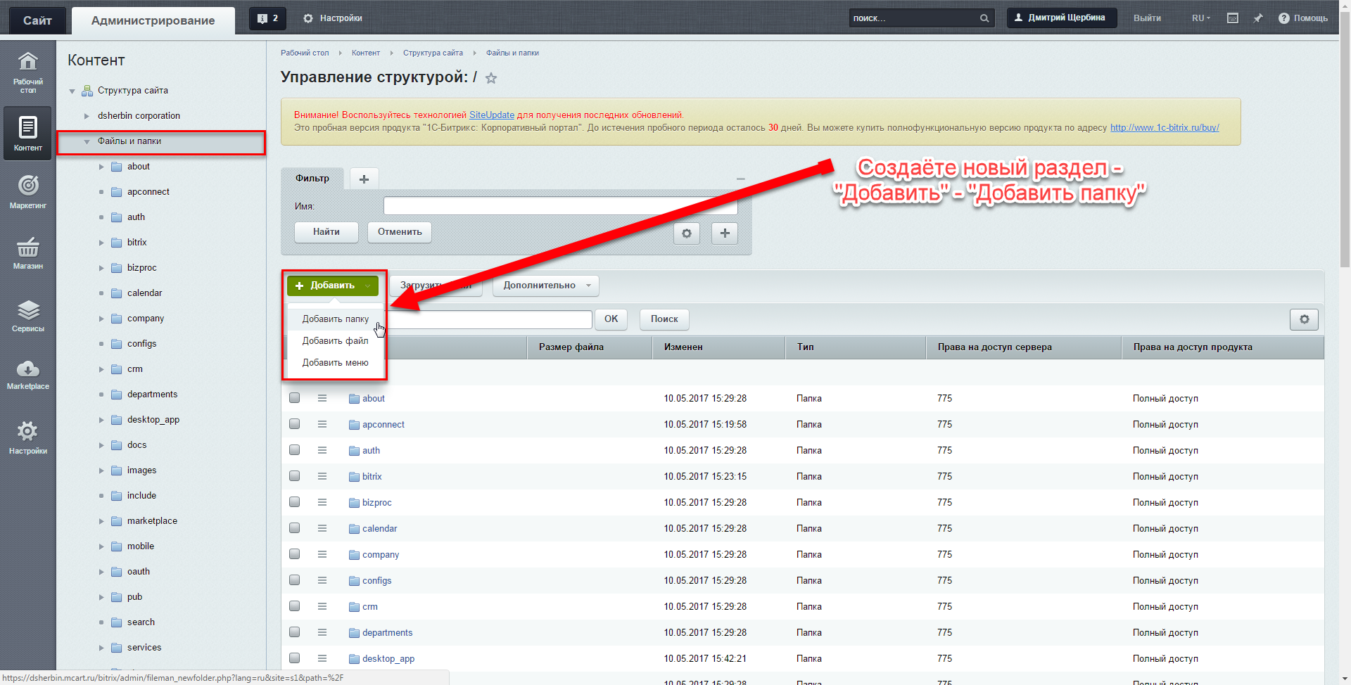 3. Перейдите в раздел Контент — Файлы и папки.