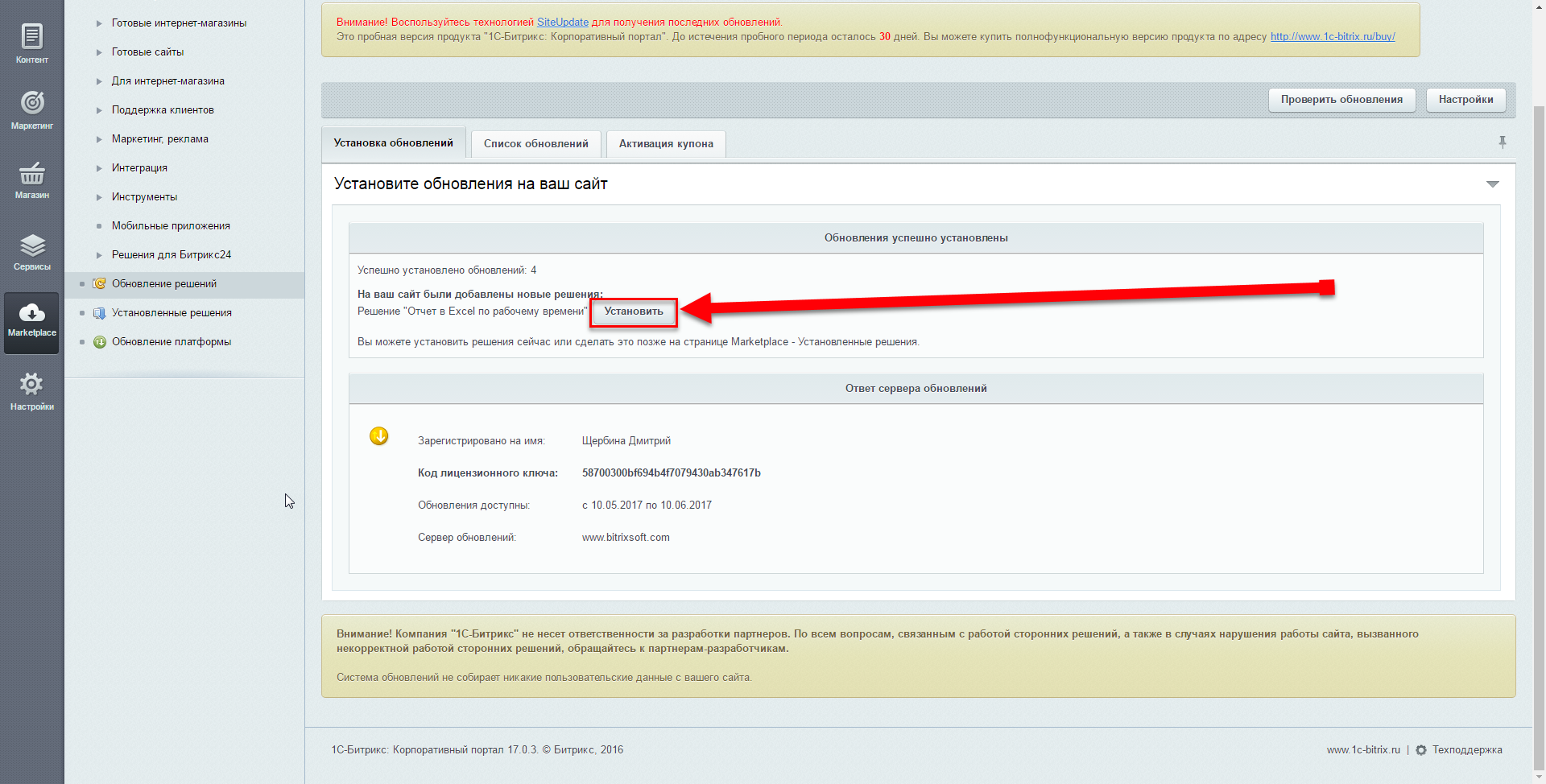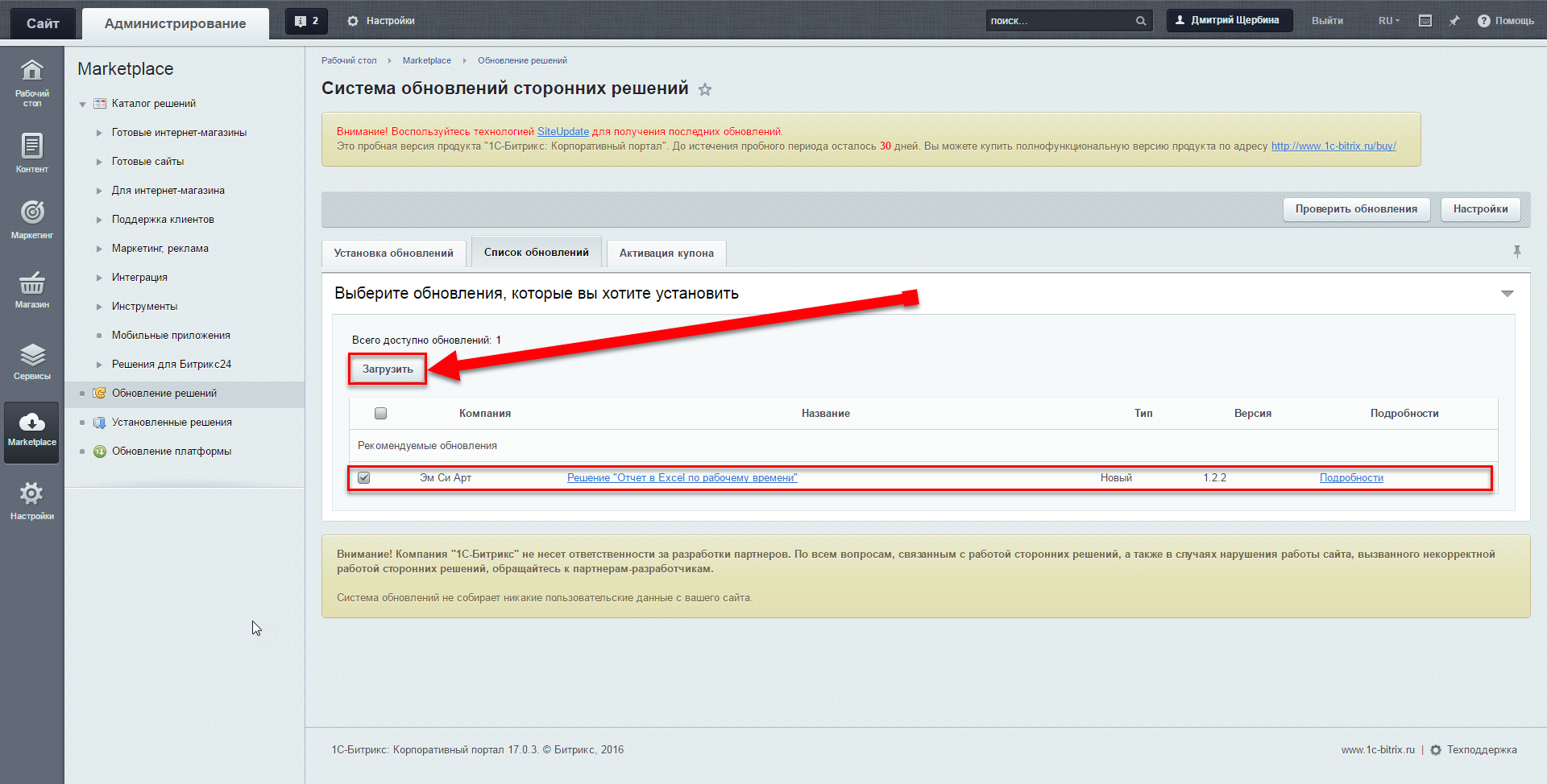 2. В административной части Битрикс нажмите Загрузить, затем Установить.