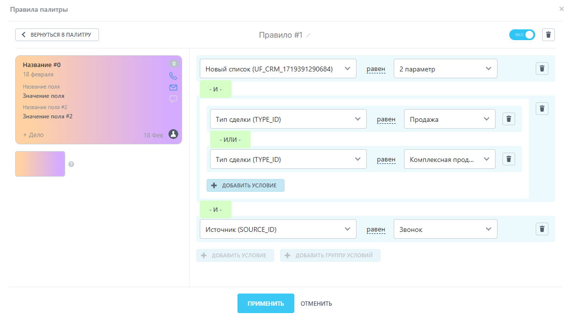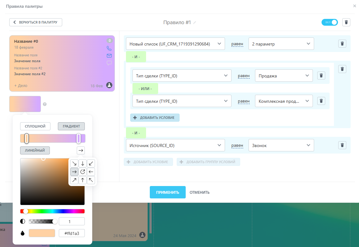 Модуль предназначен для настройки цвета заливки карточек сущностей в режиме отображения "Канбан" и "Список" в разделе CRM. Пользователи могут задавать правила, на основе которых карточки будут окрашиваться в определенные цвета. Теперь доступна более гибкая настройка правил с помощью "Групп условий"! А также для окрашивания можно применять градиент! Сохранена обратная совместимость с бесплатной версией - Ваши настройки сохранятся.