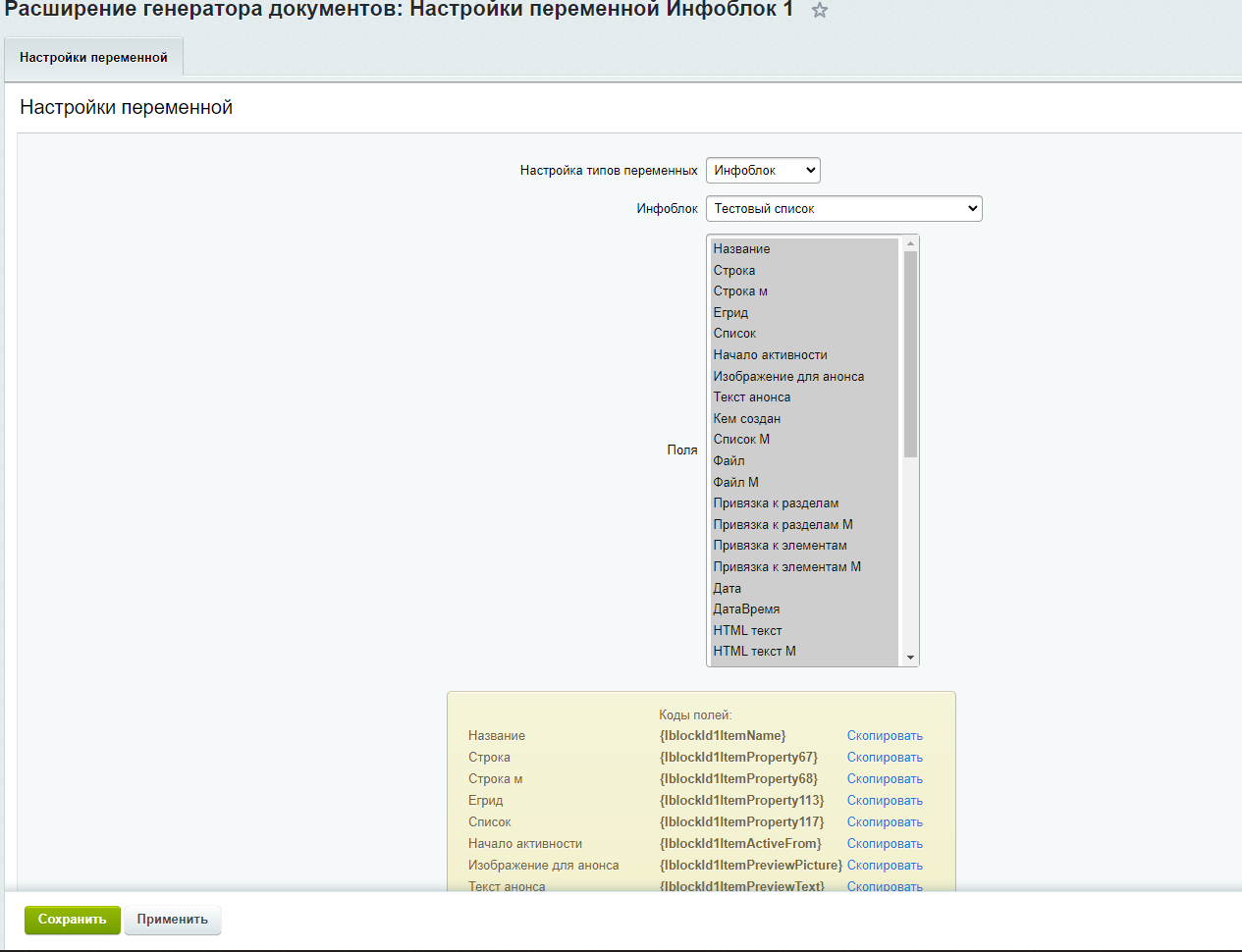 В блоке с подсказкой можно скопировать коды полей для вставки в шаблон документа.