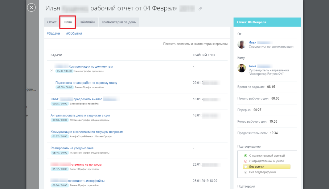 Линейные руководители видят всю работу, которую выполнял сотрудник в задачах, CRM, календаре Битрикс24. Могут задать уточняющий вопрос по конкретной задаче или сделке или поменять приоритет задач на следующий день, исходя из плана сотрудника.