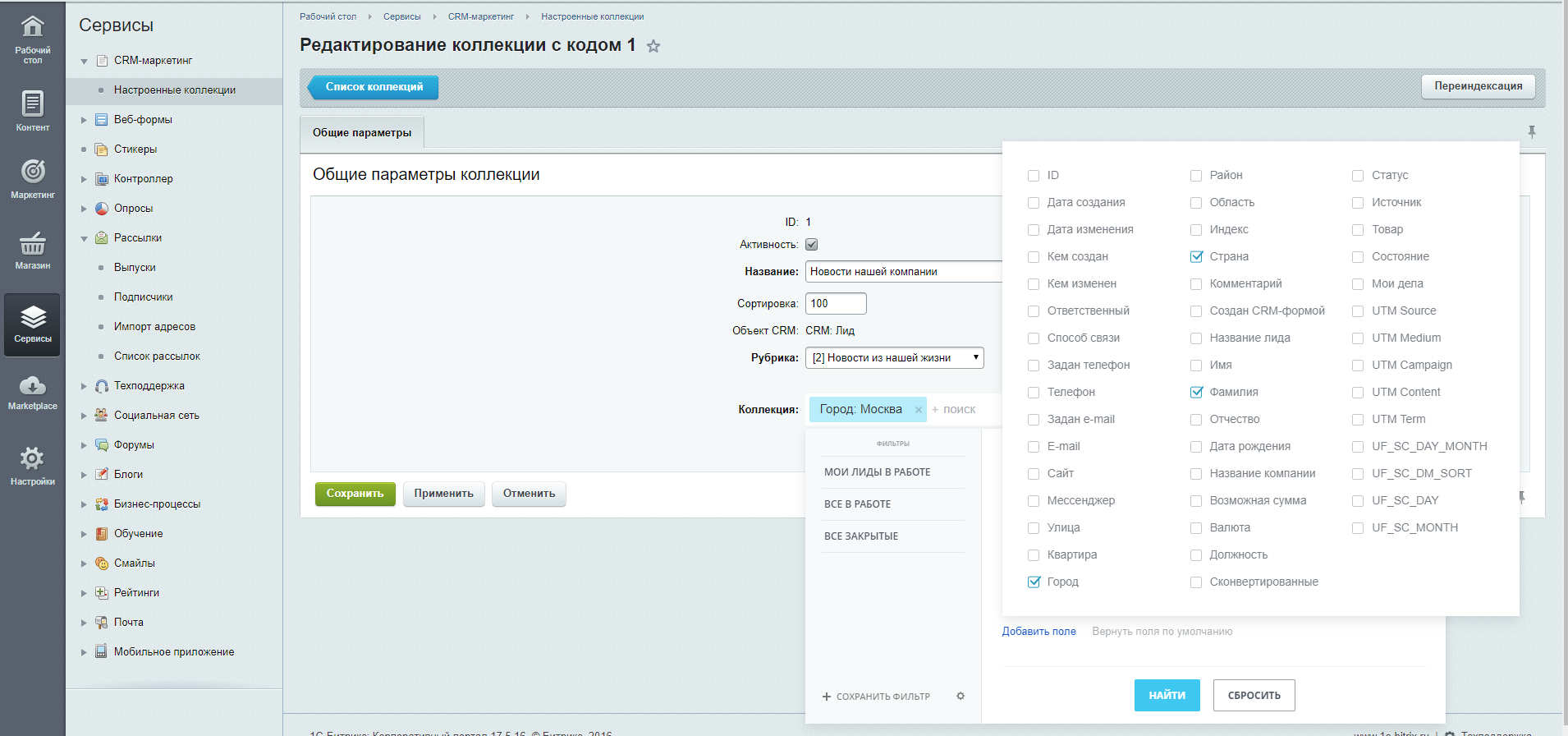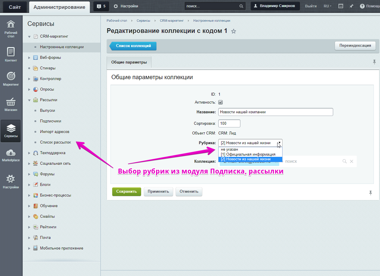 - Для работы модуля необходимо настроить связь между рубриками модуля "Подписки, рассылки" и объектами CRM на странице: Сервис -> CRM-маркетинг -> Настроенные коллекции.