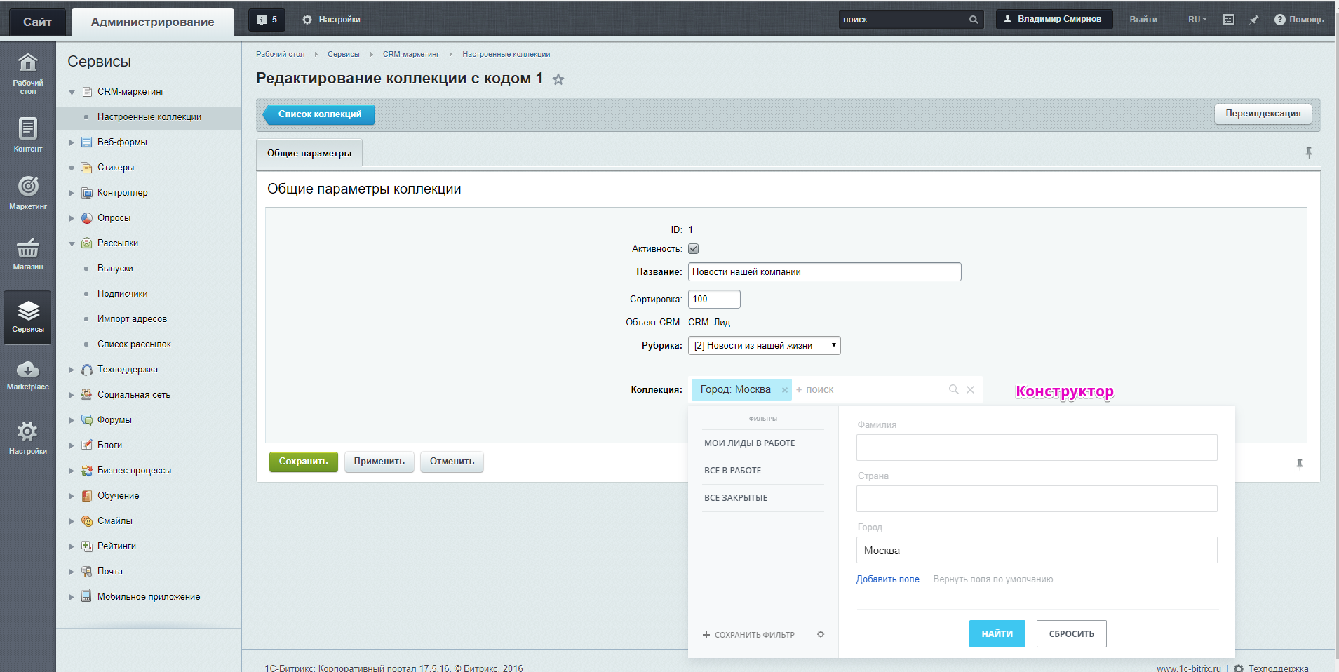 - У сохраненной коллекции становится доступен конструктор (по сути повторяющий работу фильтра в списке объектов CRM). Необходимо настроить фильтр для попадания почтовых ящиков в созданную коллекцию.
