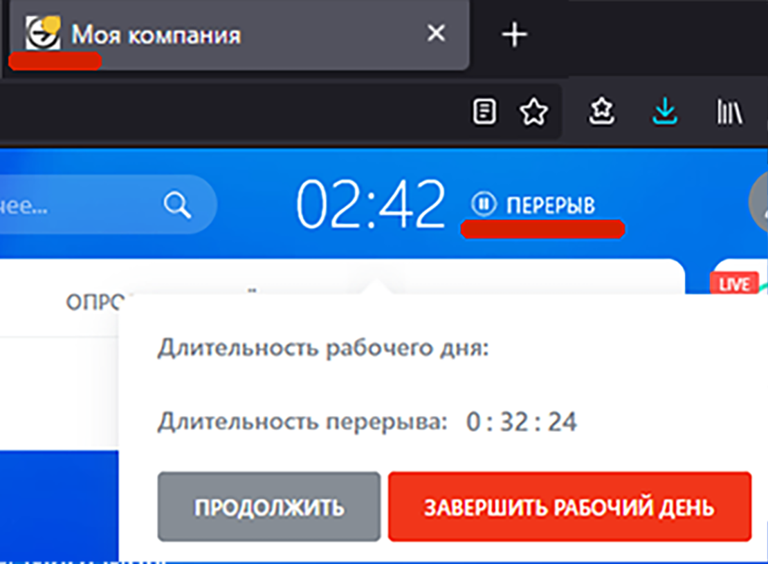 - **Жёлтый цвет**: Рабочий день на паузе.