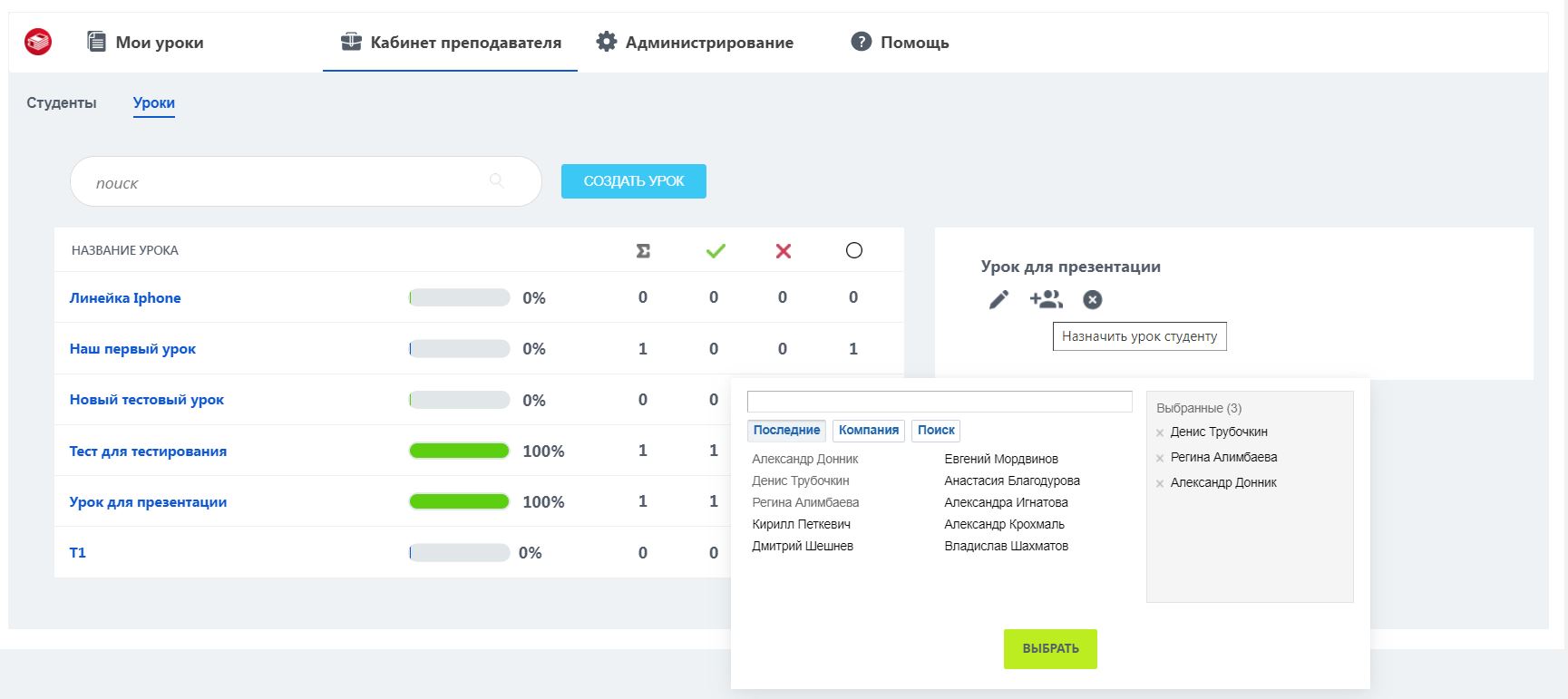 Удобная статистика дает понять, как продвигается выполнение урока у студентов.