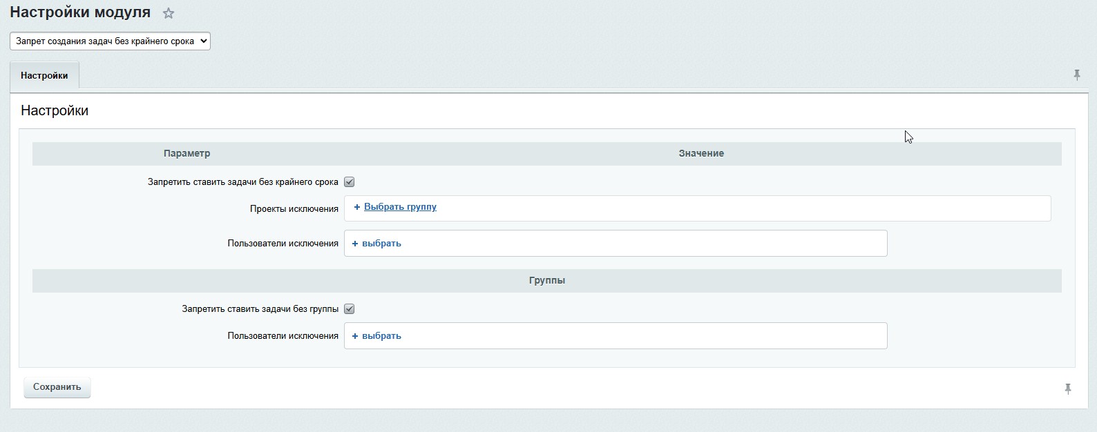 Модуль позволяет включать и отключать запреты отдельно для крайних сроков и проектов, предоставляя вам полный контроль над процессом управления задачами.