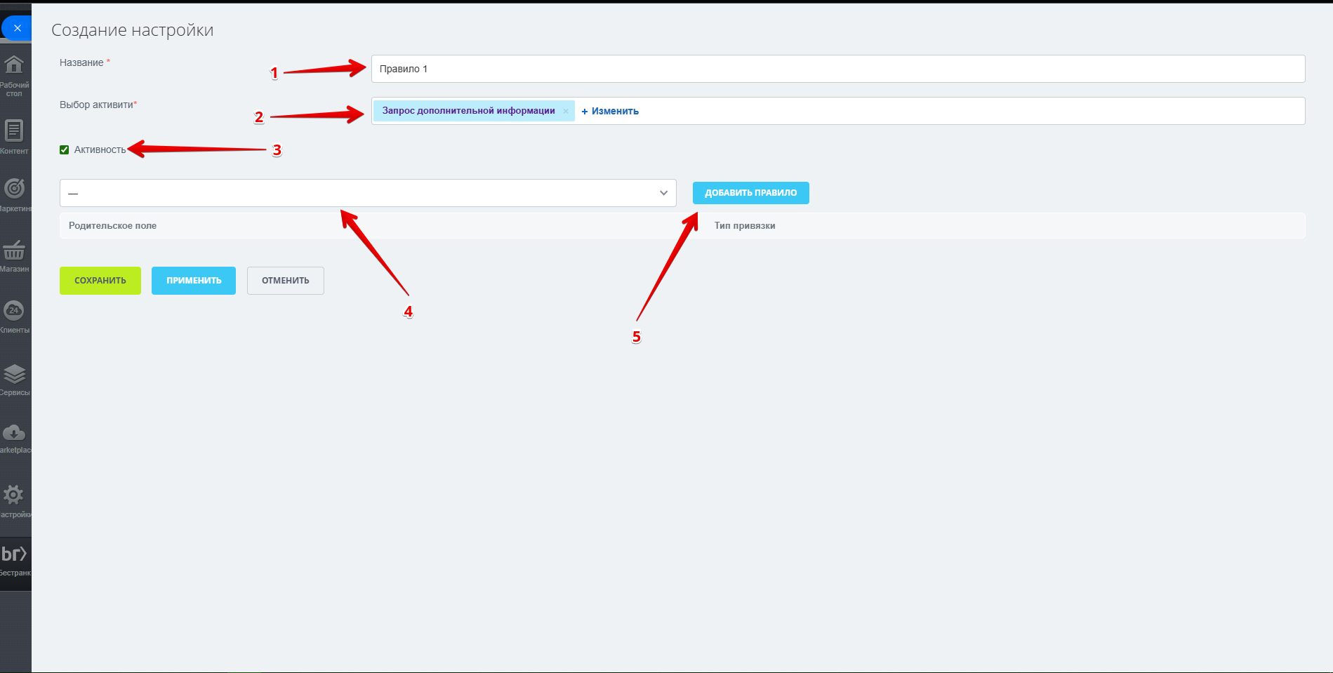 4. Выбор родительского поля. На текущий момент в качестве родительских можно выбирать поля с типом "Список" и "Да/нет"