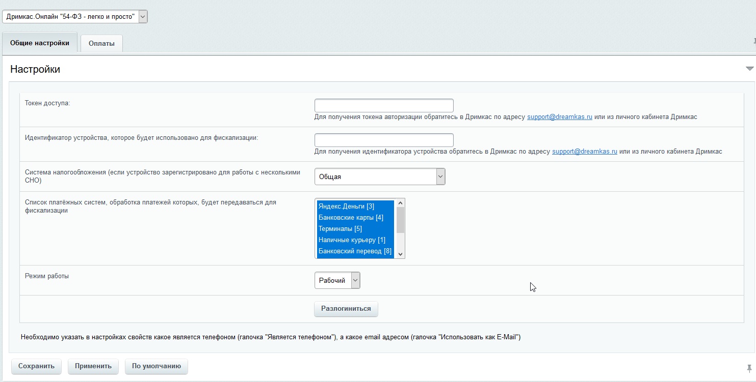 Настройки самого модуля находтся здесь: Рабочий стол -> Настройки -> Настройки продукта -> Настройки модулей -> Дримкас.Онлайн "54-ФЗ - легко и просто" или по адресу: Адрес_Вашего_Сайта/bitrix/admin/settings.php?mid=profit.dreamkas&lang=ru).