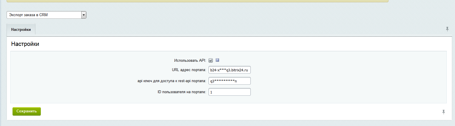 3. Указать адрес портала, id пользователя, токен, отметить активным чек-бокс "Использовать API" (см. скриншот для примера)