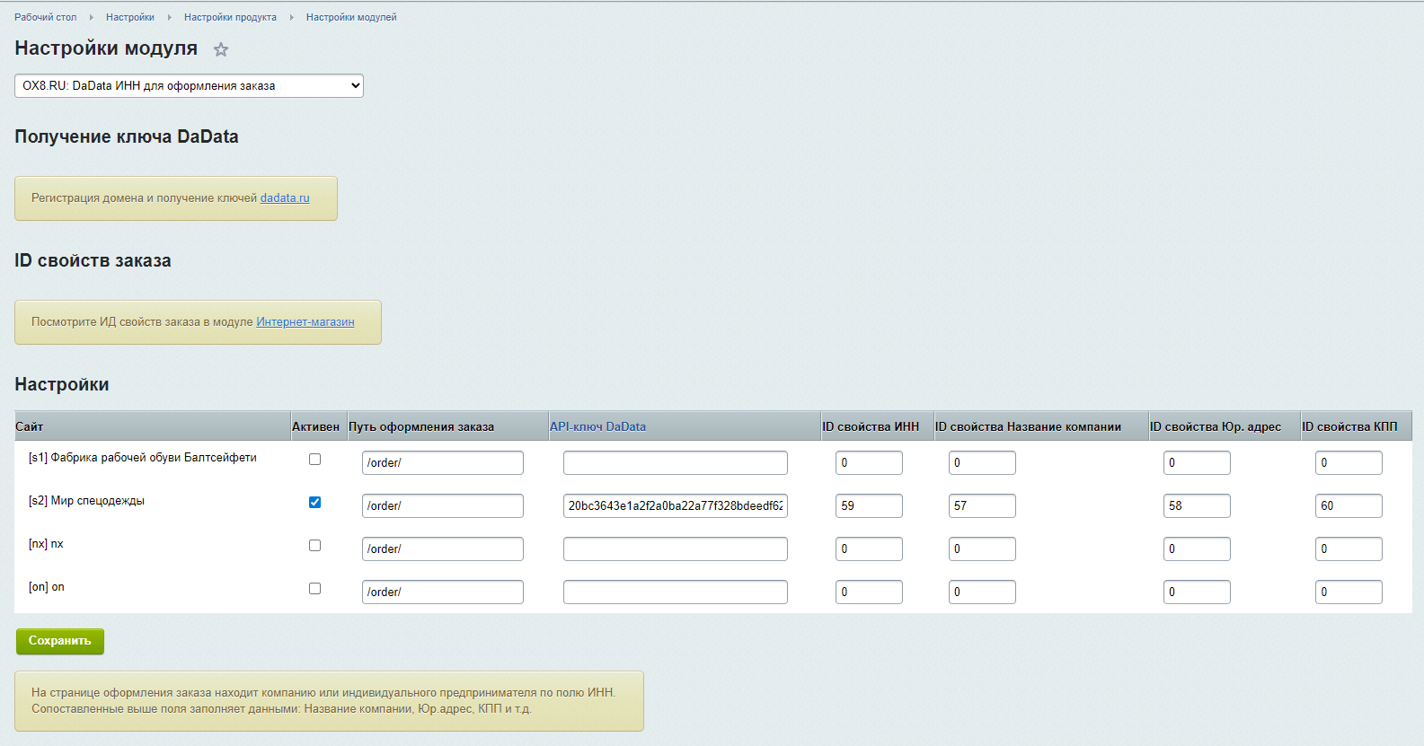 - Перейдите в Настройки → Настройки продукта → Настройки модулей → OX8.RU: DaData ИНН для оформления заказа.