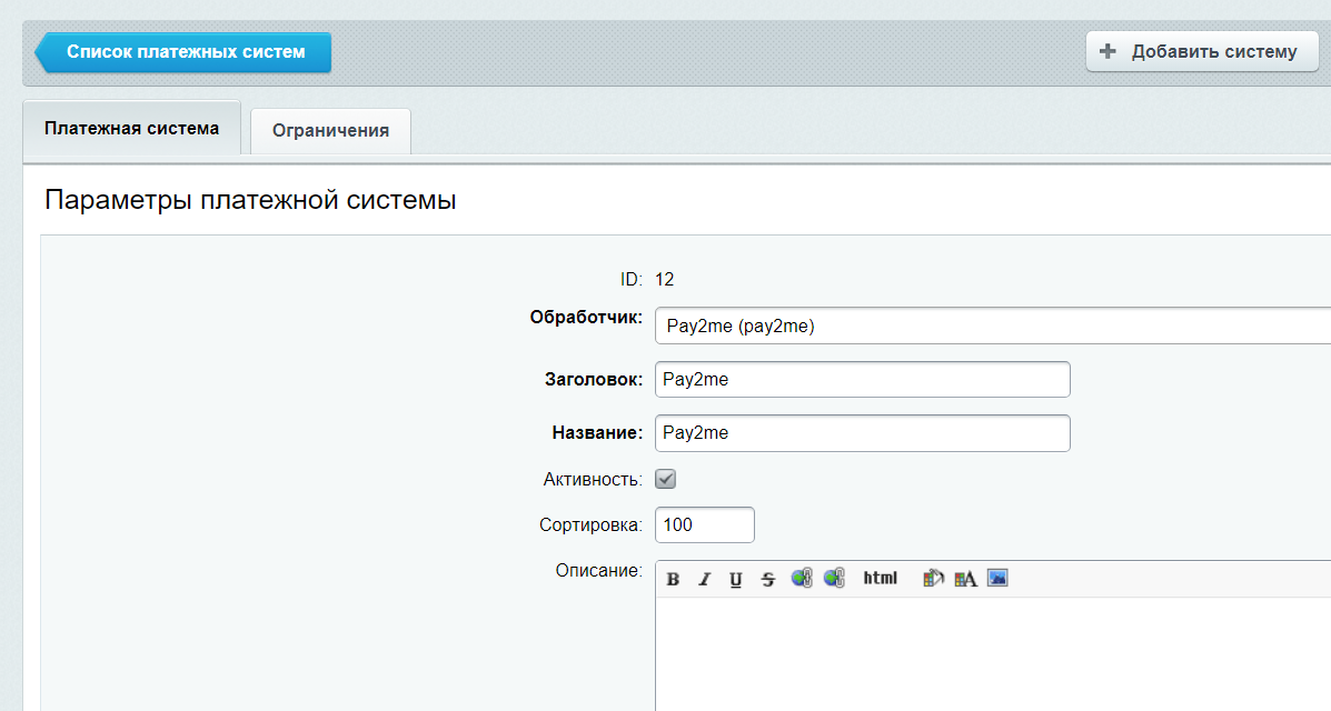 7. Сделать платежную систему активной и нажать "Сохранить"