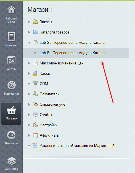 После установки в меню панели администрирования появляется страница Магазин->Lab-Su.Перенос цен в модуль Каталог->Lab-Su.Перенос цен в модуль Каталог