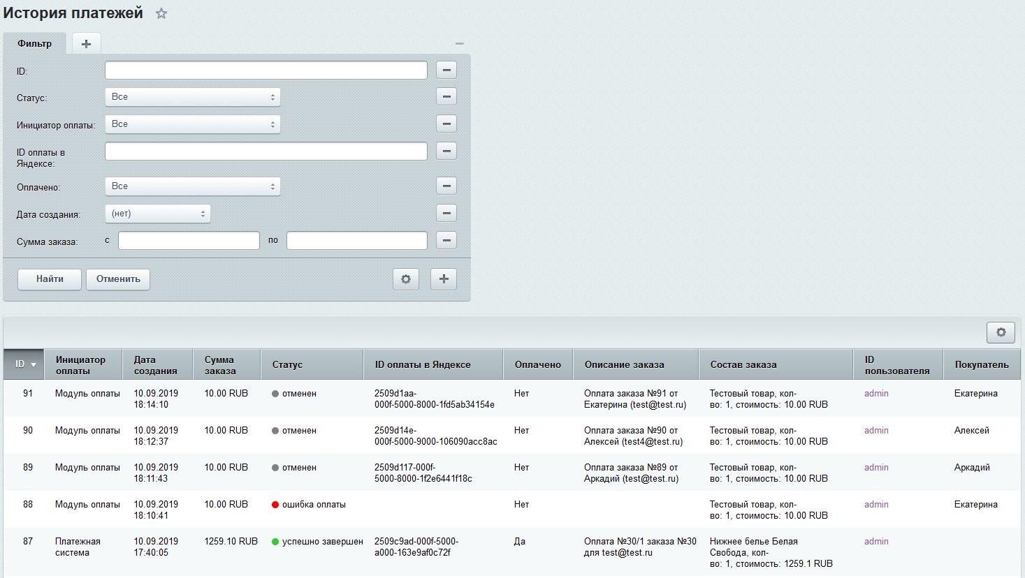 6. Протестируйте прием платежей на Вашем сайте и проверьте историю платежей на странице "Мибок → Мибок: Платежный модуль для сайта → История платежей".