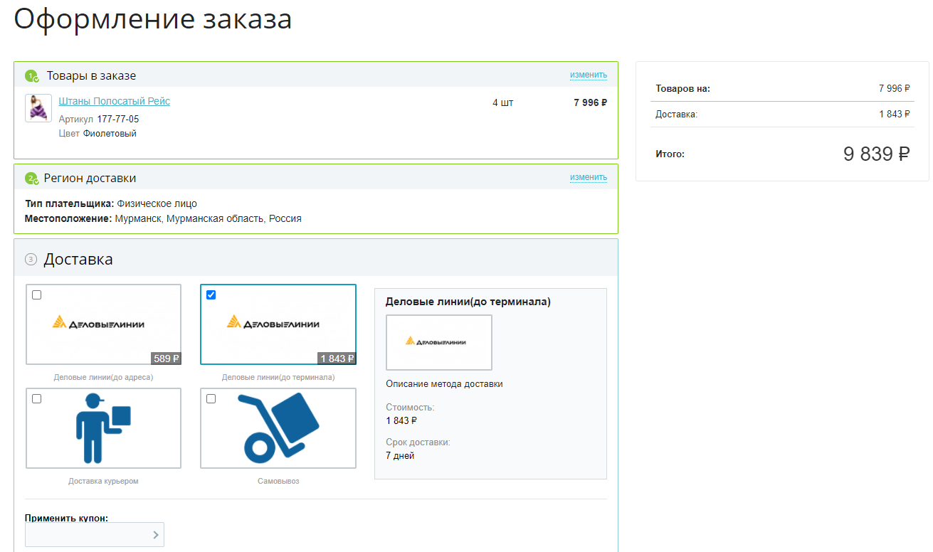 С помощью данного модуля покупатели Вашего магазина смогут рассчитать стоимость и сроки доставки товаров, добавленных в корзину; определить доступные способы доставки и терминалы получения, выбрать Деловые Линии в качестве службы доставки заказа, получить актуальный статус и дату прибытия.