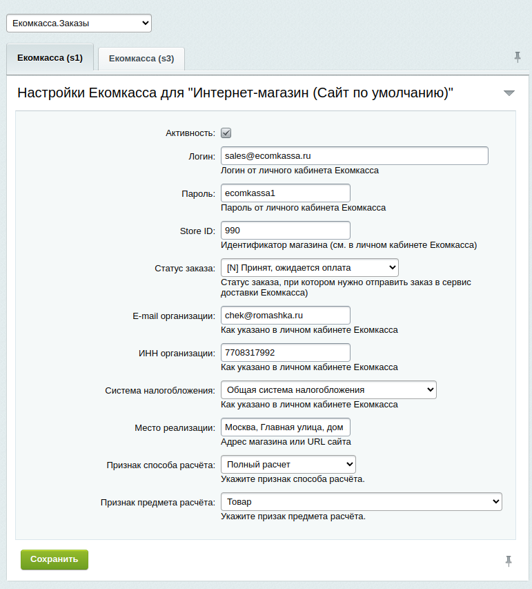 Перейдите в раздел "Настройки" - "Настройки продукта" - "Настройки модулей" - "Екомкасса.Заказы"