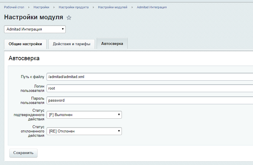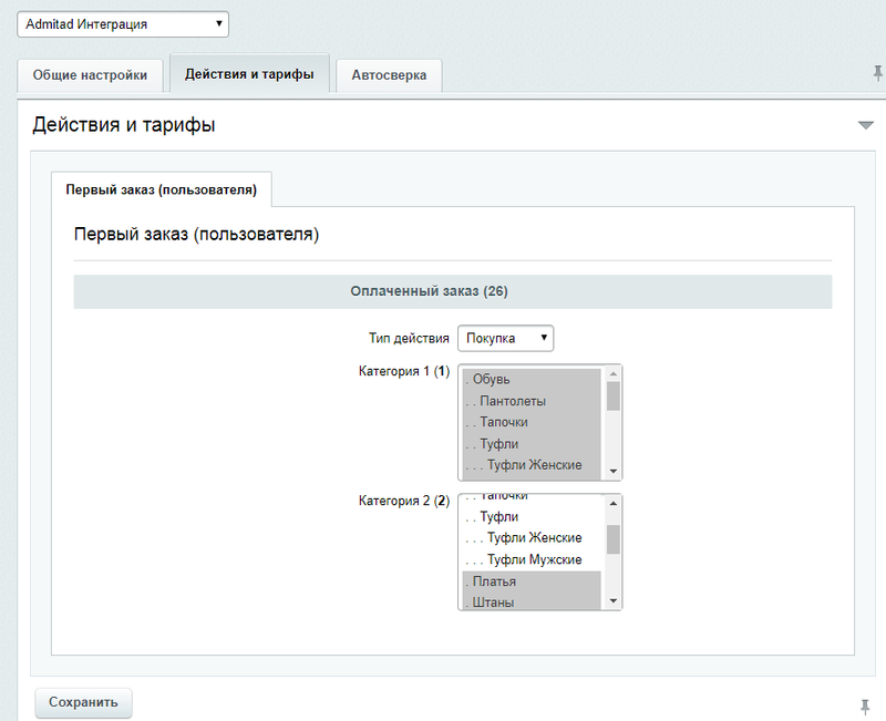 - После установки модуля, в настройках (Настройки > Настройки продукта > Модули) необходимо задать настройки целевых действий и тарифов.