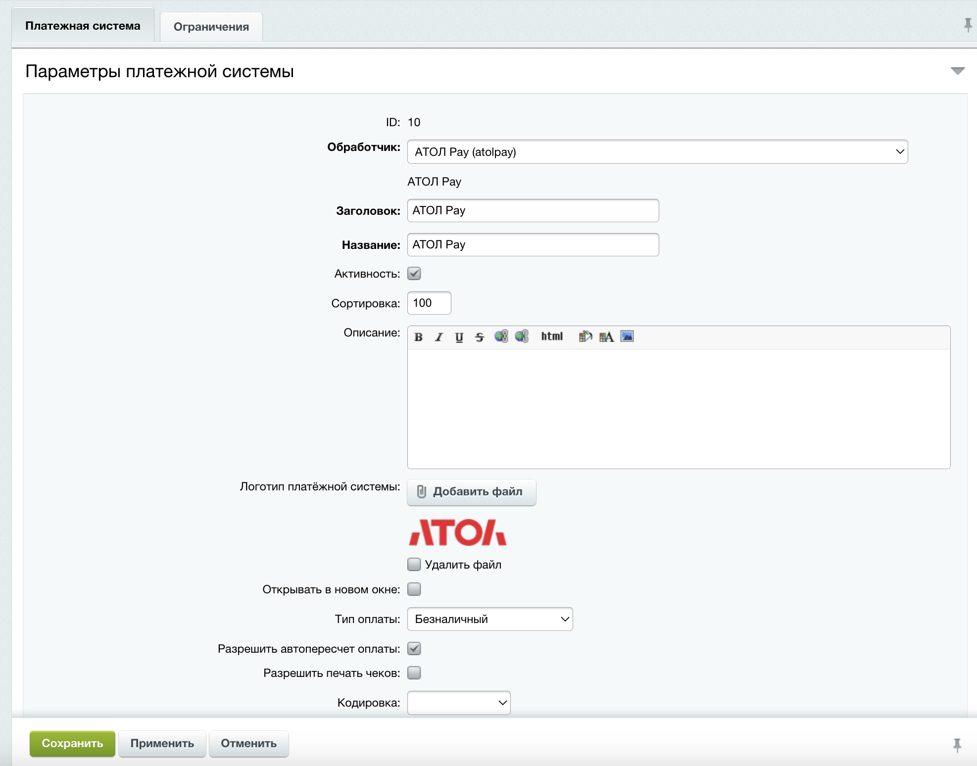 4. Ввести название платежной системы, описание и сделать ее активной.