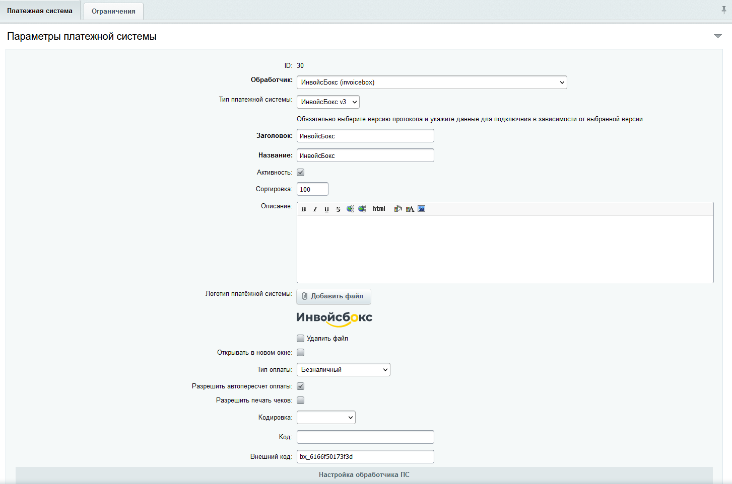 - Выберите тип платежной системы: Инвойсбокс v2