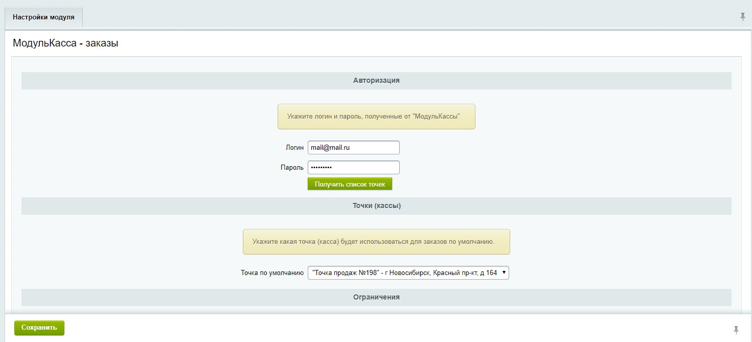 3. Авторизация: укажите логин и пароль от личного кабинета МодульКассы и нажмите "Получить список точек"