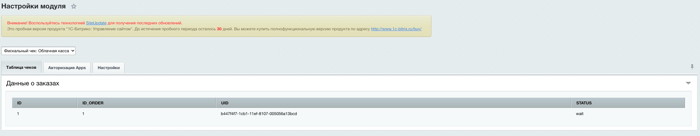 После установки необходимо перейти в настройки - настройки модулей - выбрать модуль Фискальный чек: Облачная касса и пройти авторизацию.