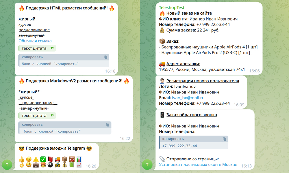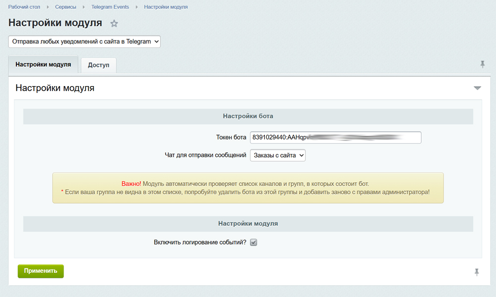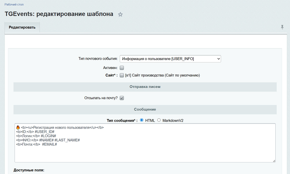Модуль предназначен для отправки сообщений в Telegram при срабатывании почтовых событий на вашем сайте. Гибкая настройка шаблонов уведомлений которые будут отправляться в указанный Telegram-чат, а так же поддержка всех редакции Битрикс от «Старт» до «Бизнес», и всех популярных готовых решений! <br /><br /><b>Ключевые отличия:</b><br />✅ Не нужны никакие профессиональные навыки для настройки и работы с модулем<br />✅ Работает на любых редакциях: «Старт», «Стандарт», «Малый бизнес», «Бизнес»<br />✅ Работает с любыми почтовыми событиями (как стандартными, так и созданными самостоятельно)<br />✅ Совместим с популярными готовыми решениями: Аспро, INTEC, Apriori, КРАКЕН и др.<br /><br /><b>Дополнительные особенности:</b><br />- Гибкая настройка шаблонов отправки уведомлений в Telegram<br />- Поддержка разных форматов сообщений HTML, MarkdownV2<br />- Поддержка смайлов, эмоджи и стикеров Telegram<br />- Можно использовать все поля, доступные в почтовых шаблонах Битрикс<br />- Возможность отправить уведомление как вместо почтового, так и совместно с ним (на Email и в Telegram)<br />- Есть журнал логирования отправки уведомлений<br />- Есть отдельная страница с проверкой шаблонов перед отправкой в Telegram<br />- Есть "Справка" с примерами шаблонов и ответами на частые вопросы<br /><br /><b>Технические требования для работы модуля:</b><br />- Версия PHP >= 8.0<br />- Установленные PHP расширения: cUrl, json.<br />- Установленный SSL-сертификат на домене (HTTPS)<br />- Для работы с событиями заказов необходим стандартный модуль Sale.<br />- Для работы с событиями веб-форм необходим стандартный модуль Form.