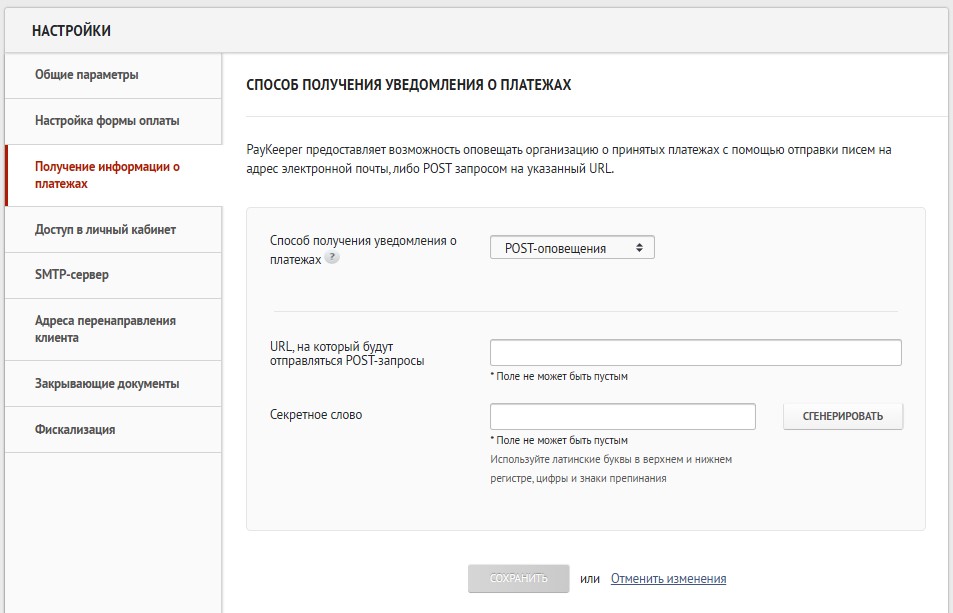 Секретное слово задаётся в личном кабинете сервера PayKeeper. Для этого перейдите на страницу «Настройки» личного кабинета. В разделе «Получение информации о платежах» выберите «POST-оповещение». Сгенерируйте секретное слово, скопируйте и вставьте в поле «Секретное слово».