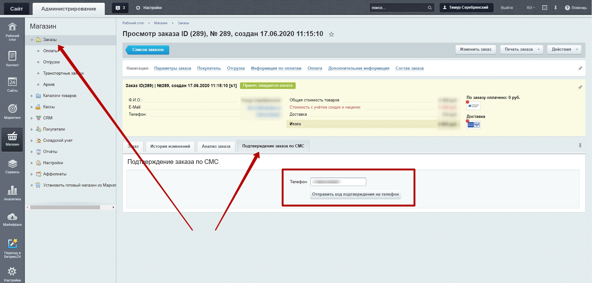 3. В административной части, в заказе, после установки нашего модуля, появится вкладка "Подтверждение заказа по СМС":