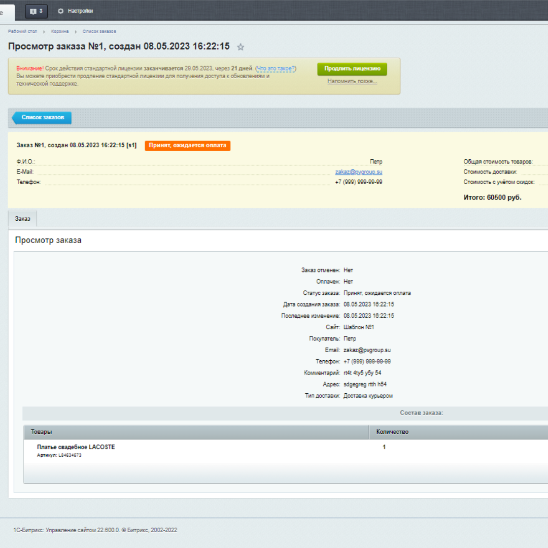 - Уведомление о новом заказе на e-mail покупателю, если поле заполнено.