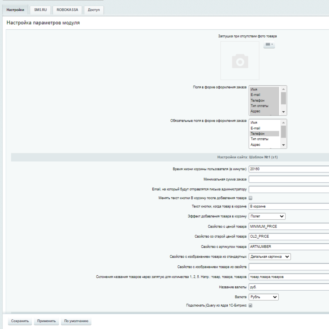 - Настройки. Общие настройки корзины: настройка свойств товара, e-mail для отправки уведомлений, эффект добавления товара в корзину и т.п.