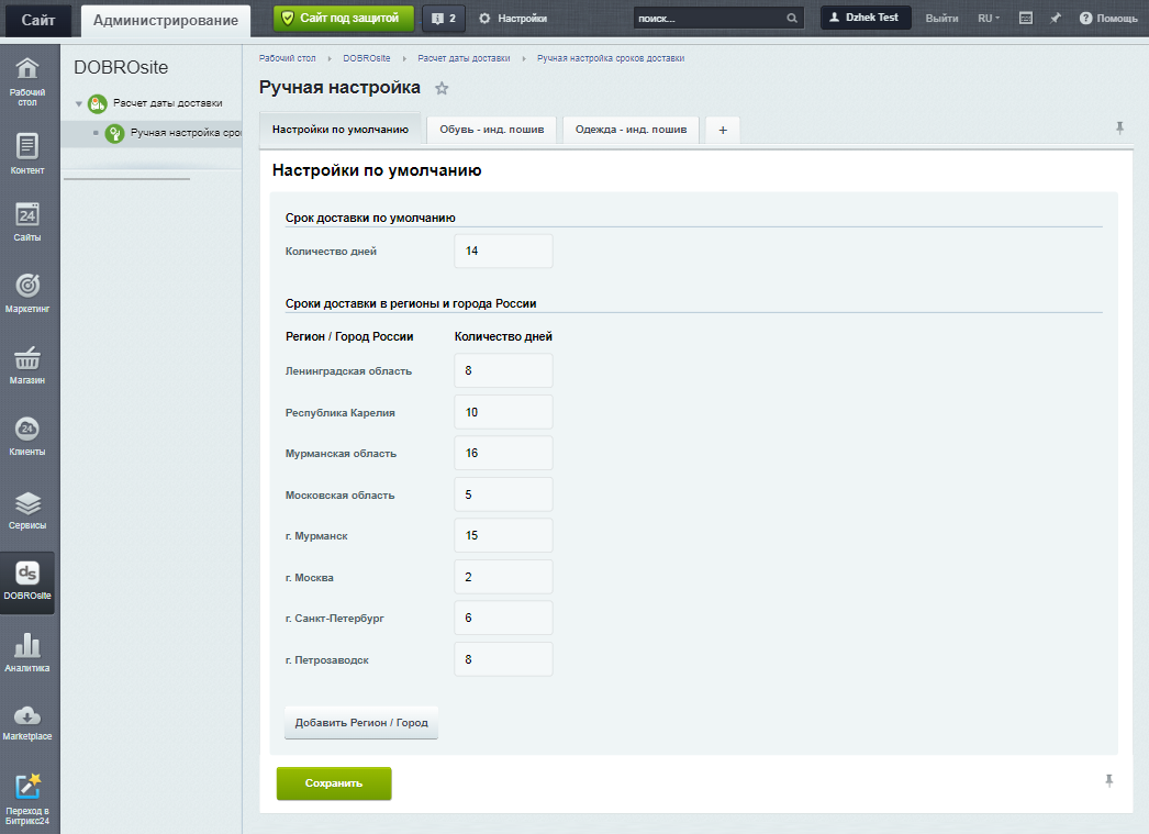 Настройка сроков доставки модуля вручную осуществляется в Административном разделе на странице DOBROsite > Расчет даты доставки > Ручная настройка сроков доставки.