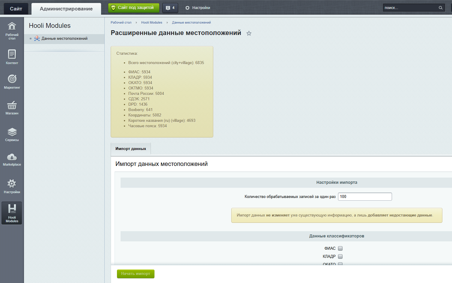 - После установки появляется раздел в панели управления (см. скриншоты) /bitrix/admin/hooli_location_import_data.php.