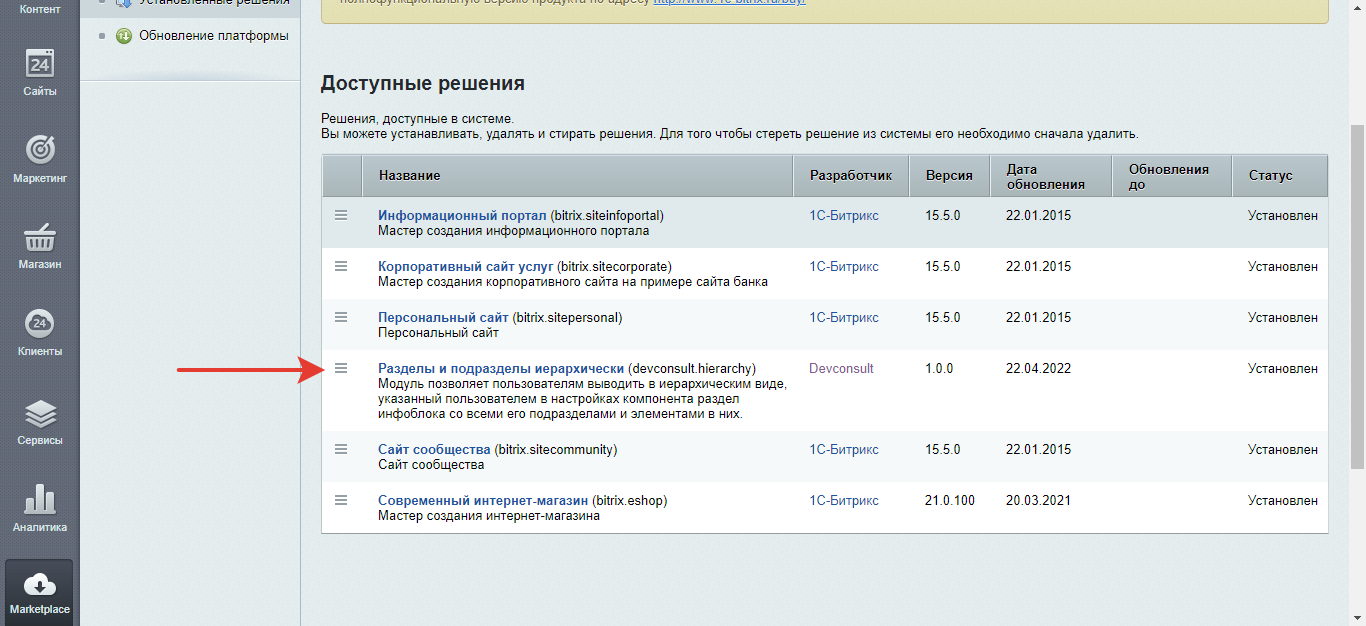 - устанавливаем модуль в списке "Установленные решения"