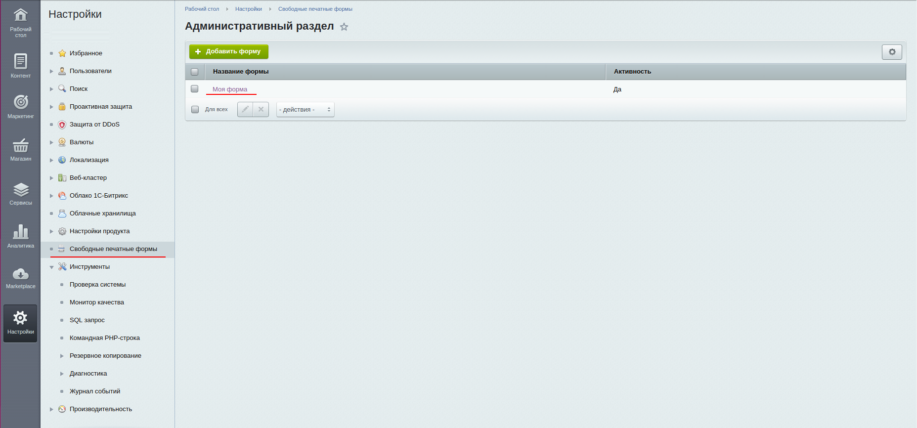 2. После установки в административном меню «Настройки» появляется раздел «Свободные печатные формы» в котором отображен список печатных форм.