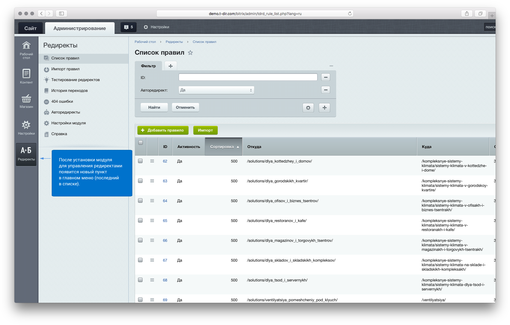 Редиректор — модуль для управления перенаправлениями посетителей между страницами сайта.
