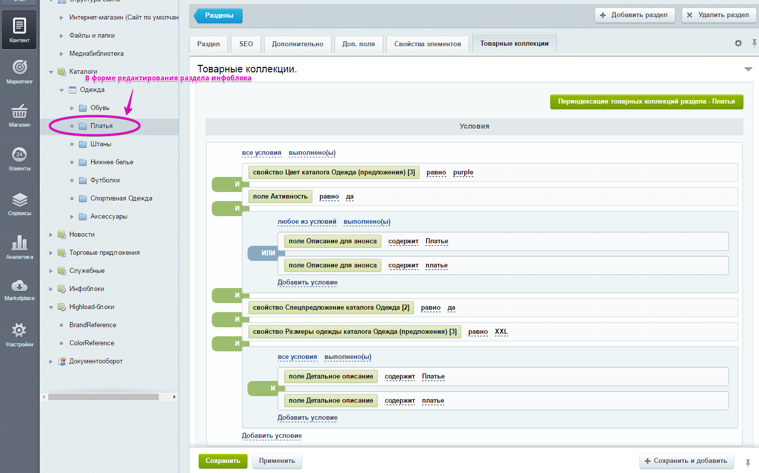 После указания всех необходимых условий коллекции, ее нужно сохранить, нажав стандартную кнопку формы редактирования раздела "Сохранить" или "Применить". После этого необходимо переиндексовать товарные коллекции раздела.