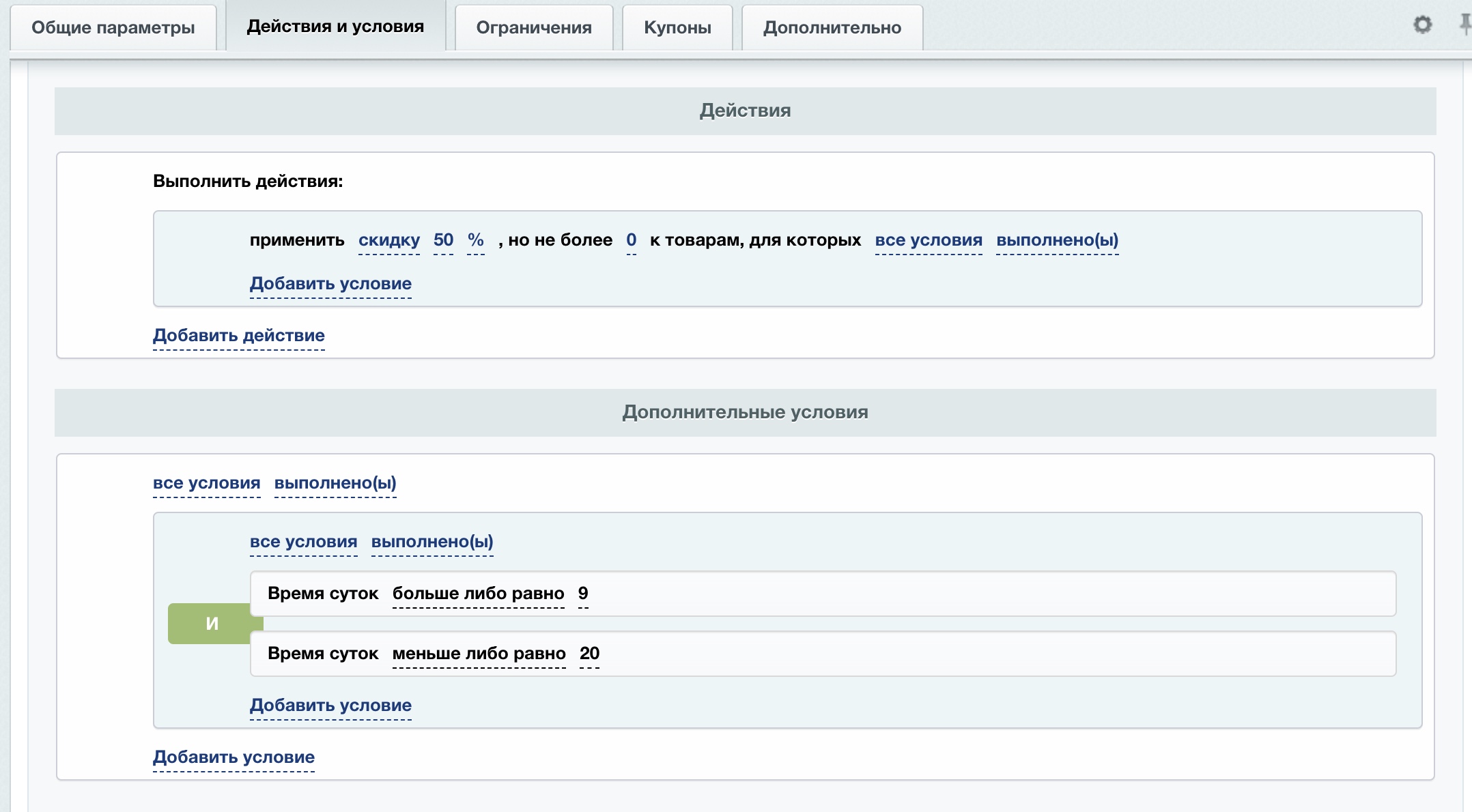 Модуль добавляет новое условие применения скидок/наценок по времени суток для в правилах работы с корзиной.